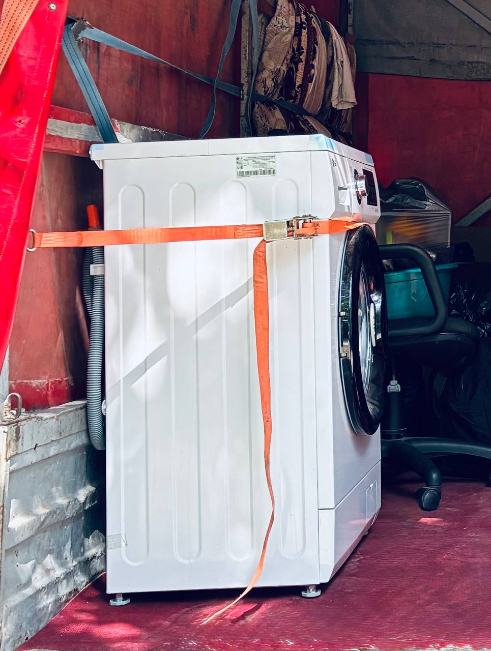 Зафиксируйте барабан транспортировочными болтами или жёсткими стяжками, иначе при тряске можно повредить амортизаторы.